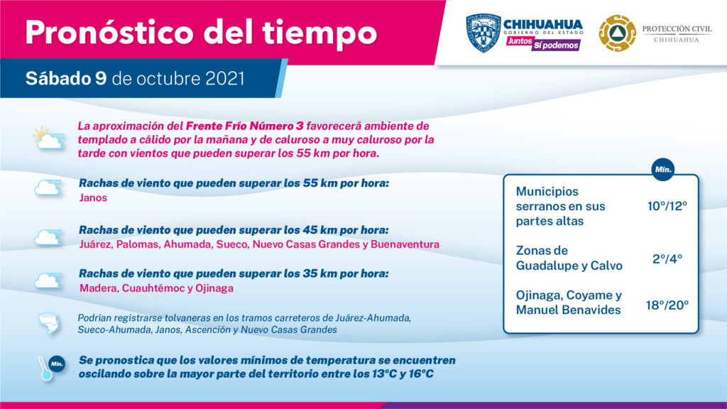 La Coordinación Estatal de Protección Civil informa que para mañana sábado se prevé la aproximación del nuevo sistema frontal número 3 acompañado de rachas de viento que pueden superar los 55 kilómetros por hora en Janos; de más de 45 km/h en Juárez, Palomas, Ahumada, Sueco, Nuevo Casas Grandes y Buenaventura y arriba de los 35 km/h en Madera, Cuauhtémoc y Ojinaga.
