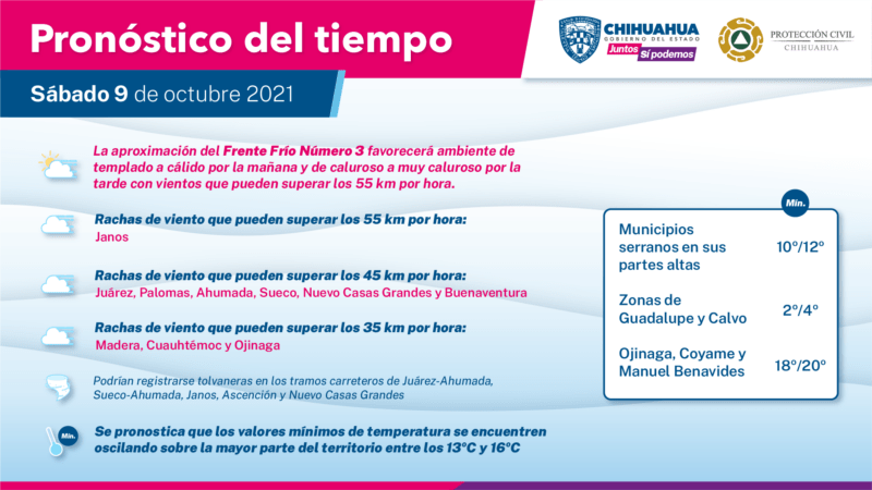 Para el domingo 10 de octubre, el frente frío número 3 en interacción con un canal de baja presión e inestabilidad atmosférica superior, favorecerá ambiente de templado a cálido por la mañana y de caluroso a muy caluroso por la tarde, con un cielo despejado, con rachas que pueden superar los 45 y 55 km/h en partes de las zona norte, noroeste y centro, incluido a Juárez, Palomas, Guadalupe, Janos, Ahumada, Namiquipa, Sueco y Cuauhtémoc.