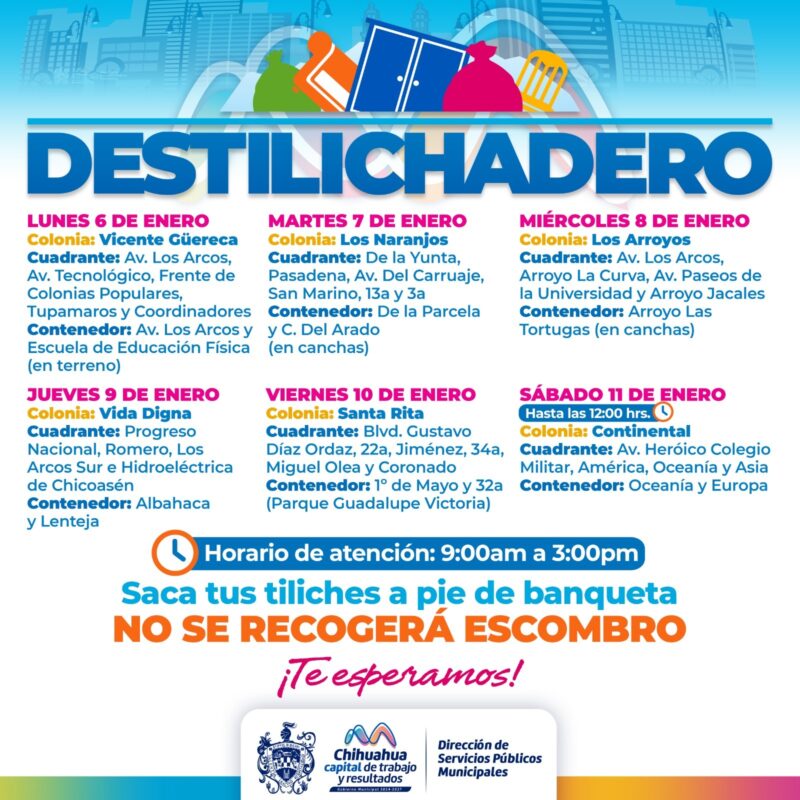 Chihuahua, Chih., a 4 de enero de 2025.- Para evitar acumulaciones de basura de grandes dimensiones en las viviendas, que podría generar plagas o problemas de salud, el Gobierno Municipal, a través de la Dirección de Servicios Públicos Municipales, informa el calendario del programa Destilichadero, que se realizará del 6 al 11 de enero en seis colonias de la Capital.