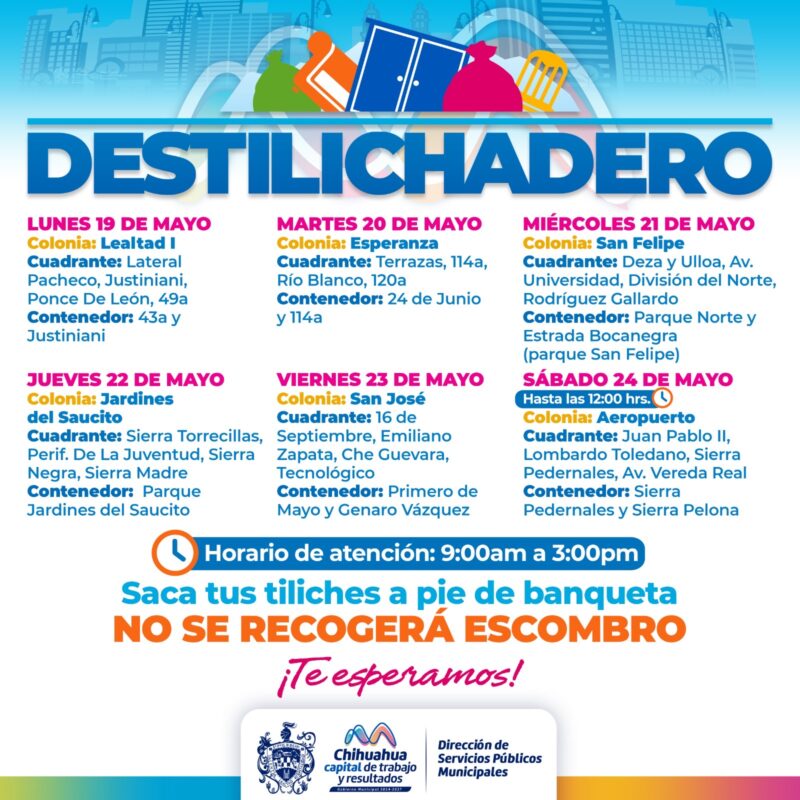 H. Ciudad de Chihuahua, Chih. A 17 de mayo de 2025.- Para evitar acumulaciones de basura de grandes dimensiones en las viviendas, que podría generar plagas o problemas de salud, el Gobierno Municipal, a través de la Dirección de Servicios Públicos Municipales, informa el calendario del programa Destilichadero, que se realizará del 19 al 24 de mayo en seis colonias de la Capital.
